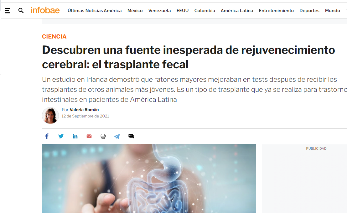 Un estudio en Irlanda demostró que ratones mayores mejoraban en tests después de recibir los trasplantes de otros animales más jóvenes. Es un tipo de trasplante que ya se realiza para trastornos intestinales en pacientes de América Latina